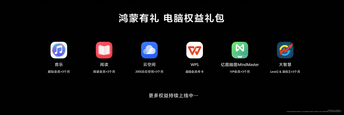 購買鴻蒙電腦新機(jī)的用戶,即可領(lǐng)取價值超800元“鴻蒙有禮”權(quán)益禮包。在本設(shè)備登錄華為賬號后,即可領(lǐng)取“華為應(yīng)用權(quán)益”,包含3個月華為音樂超鉆會員、3個月華為閱讀會員、3個月華為云空間200G會員。此外,首次登錄華為賬號后第9天,還可領(lǐng)取更多權(quán)益,包含WPS Office 超級會員年卡、億圖腦圖MindMaster VIP會員季卡、大智慧 Level2&波段王季卡。