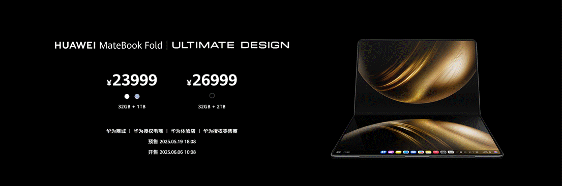 售價方面,HUAWEI MateBook Fold 非凡大師新品提供2個配置可選,其中32GB+1TB版本售價23999元、32GB+2TB版本售價26999元。5月19日18:08開啟預(yù)售,6月6日10:08在華為商城/華為授權(quán)電商,華為體驗店/華為授權(quán)零售商平臺全面開售。