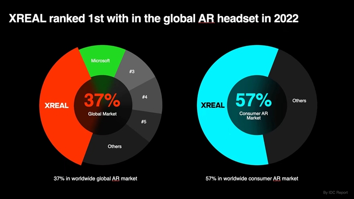 XREAL甫一成立便主打海外市場,2022年,海外業(yè)務在XREAL營收中占比達到了70%。徐馳呼吁中國企業(yè)不要再在家門口打口水仗,一起去“卷”國外企業(yè),讓全世界感受到“中國力量”。一方面,這樣可以收集到更多消費者的真實反饋;另一方面,這是一個前所未有的市場機會——XR領域尚未出現(xiàn)一款全球化的終端在引領,“盡管蘋果出了牌,但大家發(fā)現(xiàn)蘋果帶不動”。
